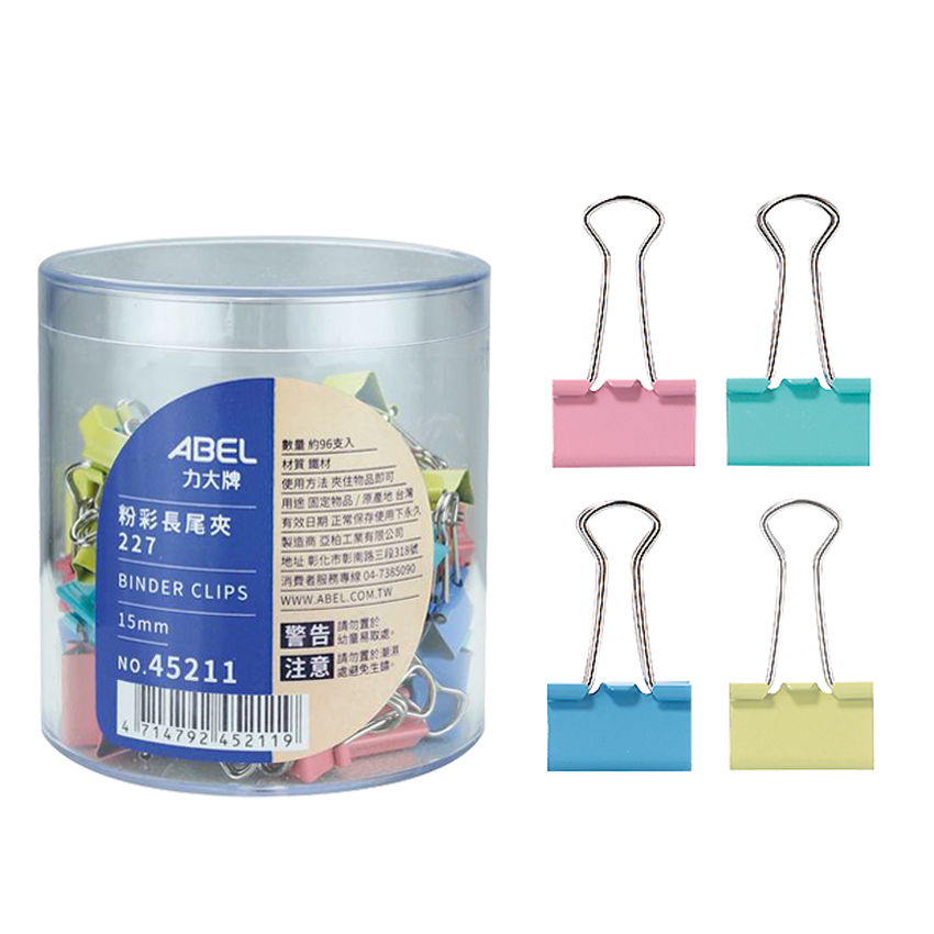 ABEL 45211 227 15mm 粉彩長尾夾X一桶96入