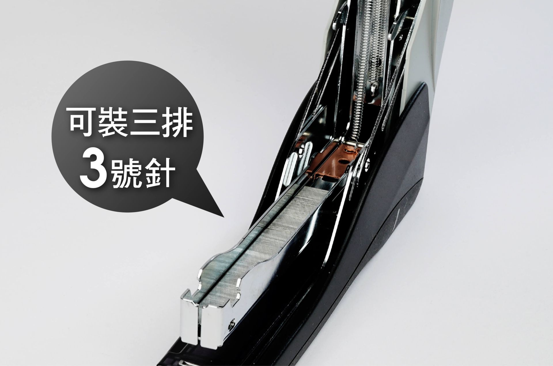 • 可放3排3號針(24/6,150針)或2排26/6針,省時不需常更換